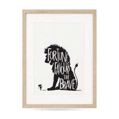 This original print presents our original illustrated version of our favourite proverb "Fortune Favours the Brave". It incorporates some of our popular characters (the lion & the mouse). The timeless saying and the silhouetted images create a classic visual.